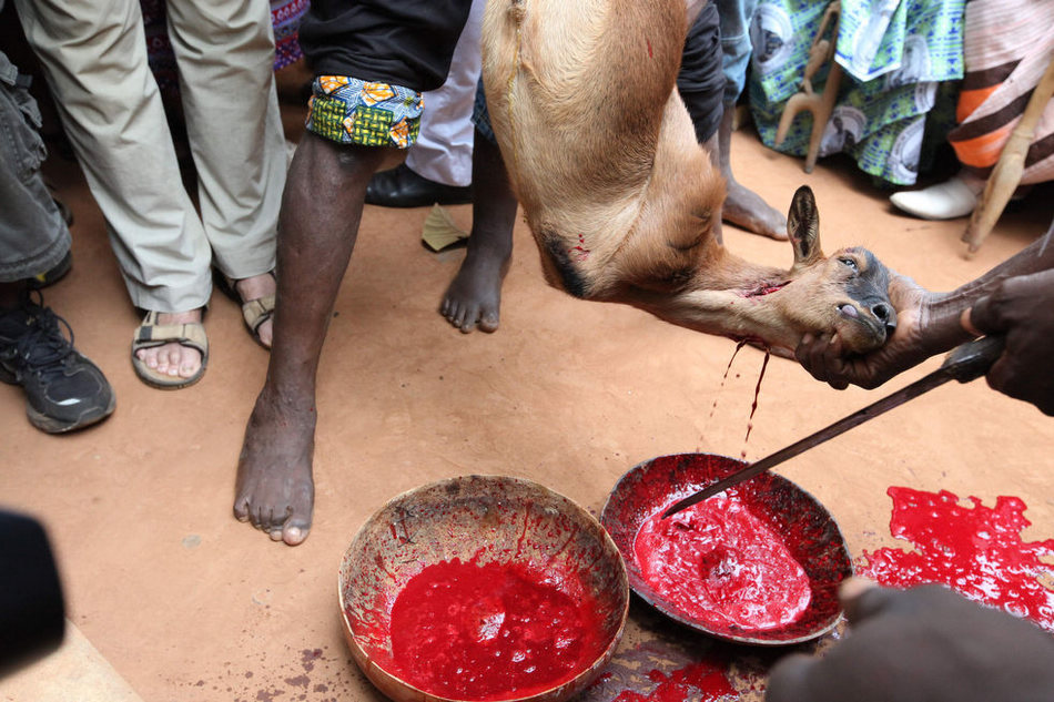 当地时间1月10日,献祭的山羊被宰杀放血。